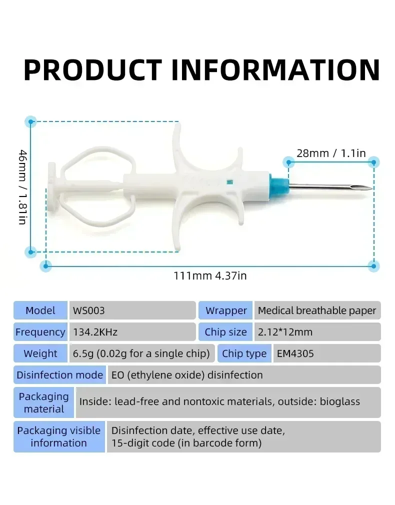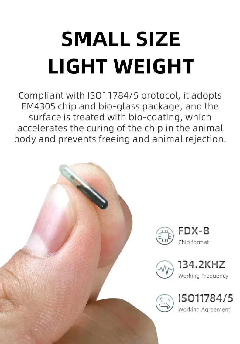| Microchip | Frequency: 134.2kHz Standard: ISO 11784/5 FDX-B Dimension: 2.12×12/1.4X8/1.25X7mm Housing Material: Bio-glass Others: Parylene coating |