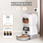 Metal food tray Memory function 3 AA batteries, priority adapter power supply. Removable metal food tray for easy cleaning. In the event of a power failure, the system automatically saves the current feeding parameters. Smart chip, automatic detection of motor stuck function. Protect the motor 17.8cmx16.3cmx32.3cm