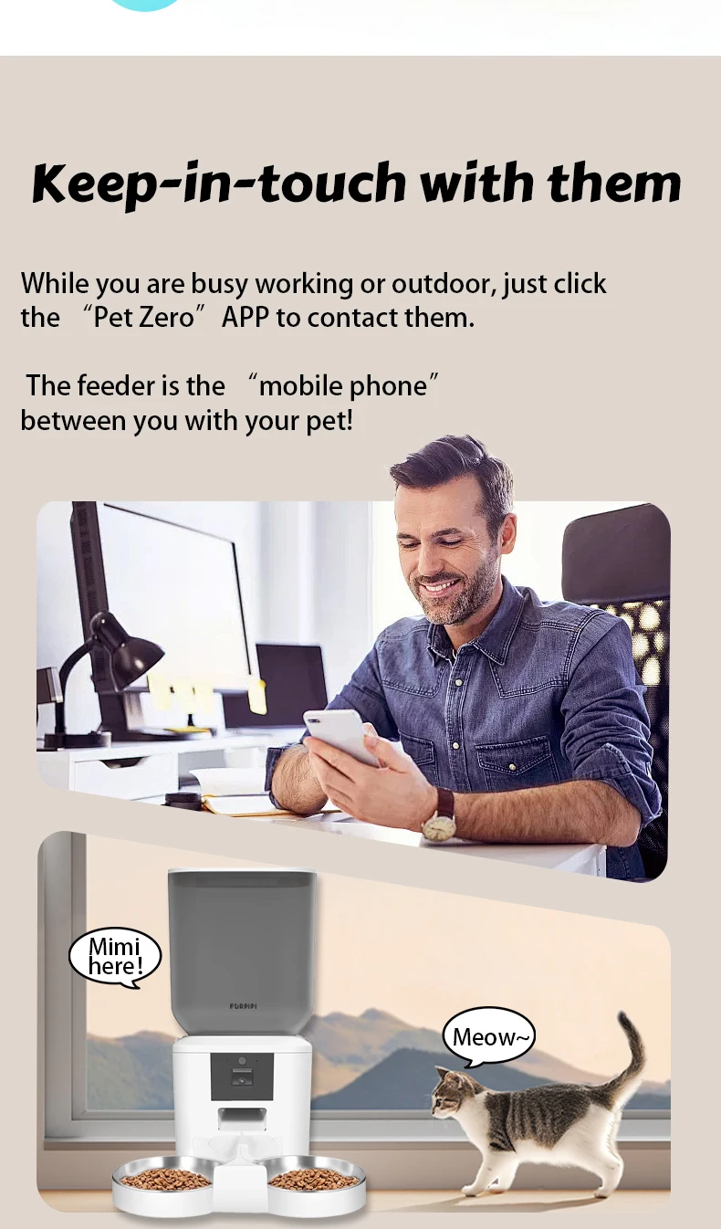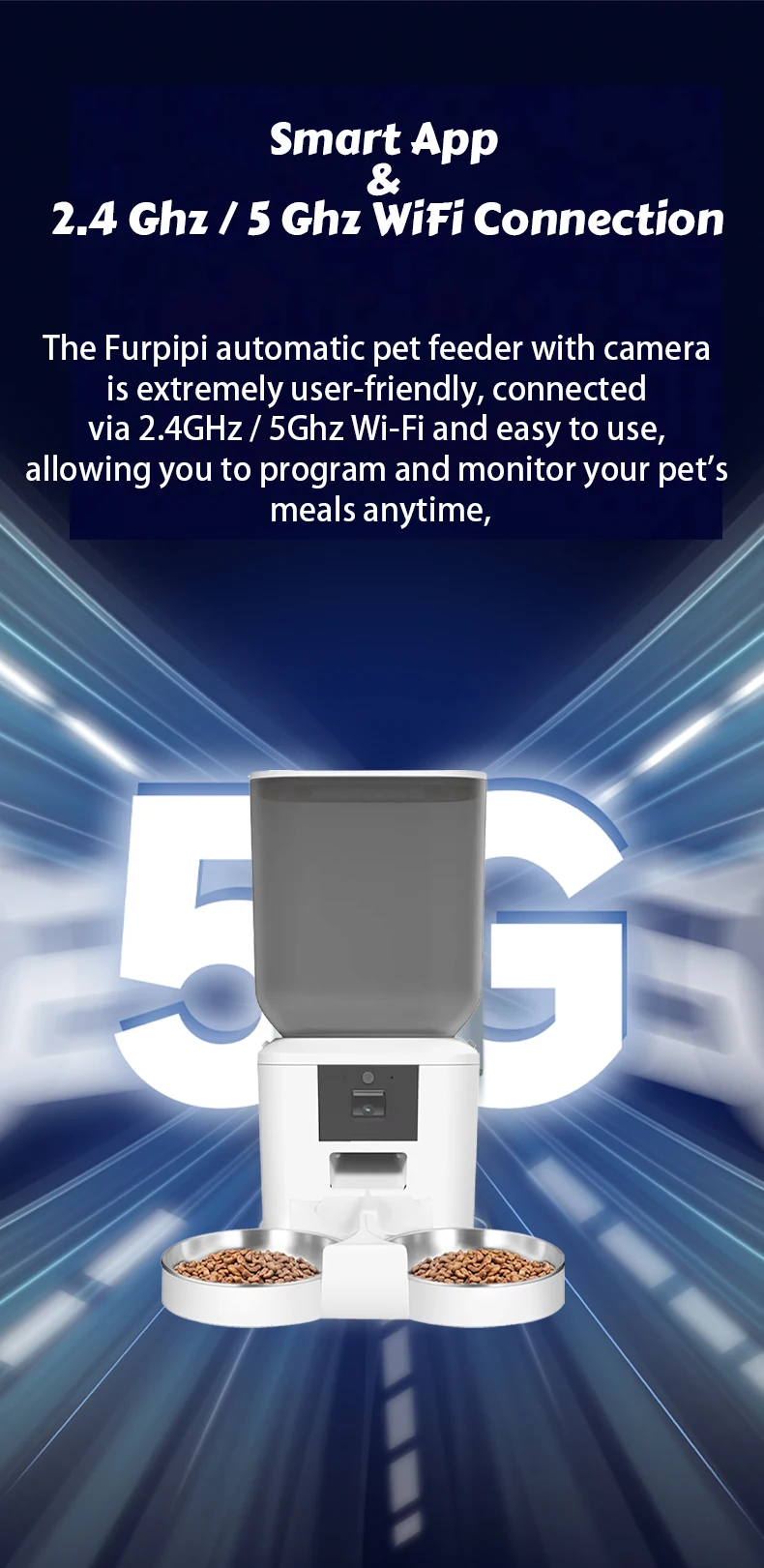 The Furpipi automatic pet feeder with camera is extremely user-friendly, connected via 2.4GHz / 5Ghz Wi-Fi and easy to use, allowing you to program and monitor your pet’s meals anytime, anywhere with the “Pet Zero ” app for iOS and Android phones. You can feed your pets anytime, anywhere on your smartphone and view the feeding log on App to make sure the cat food dispenser is working as scheduled. The smart cat food dispenser can be controlled from multiple family members’ smartphones.