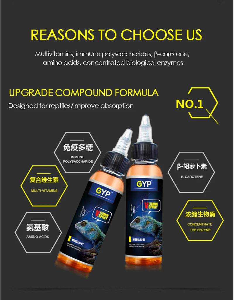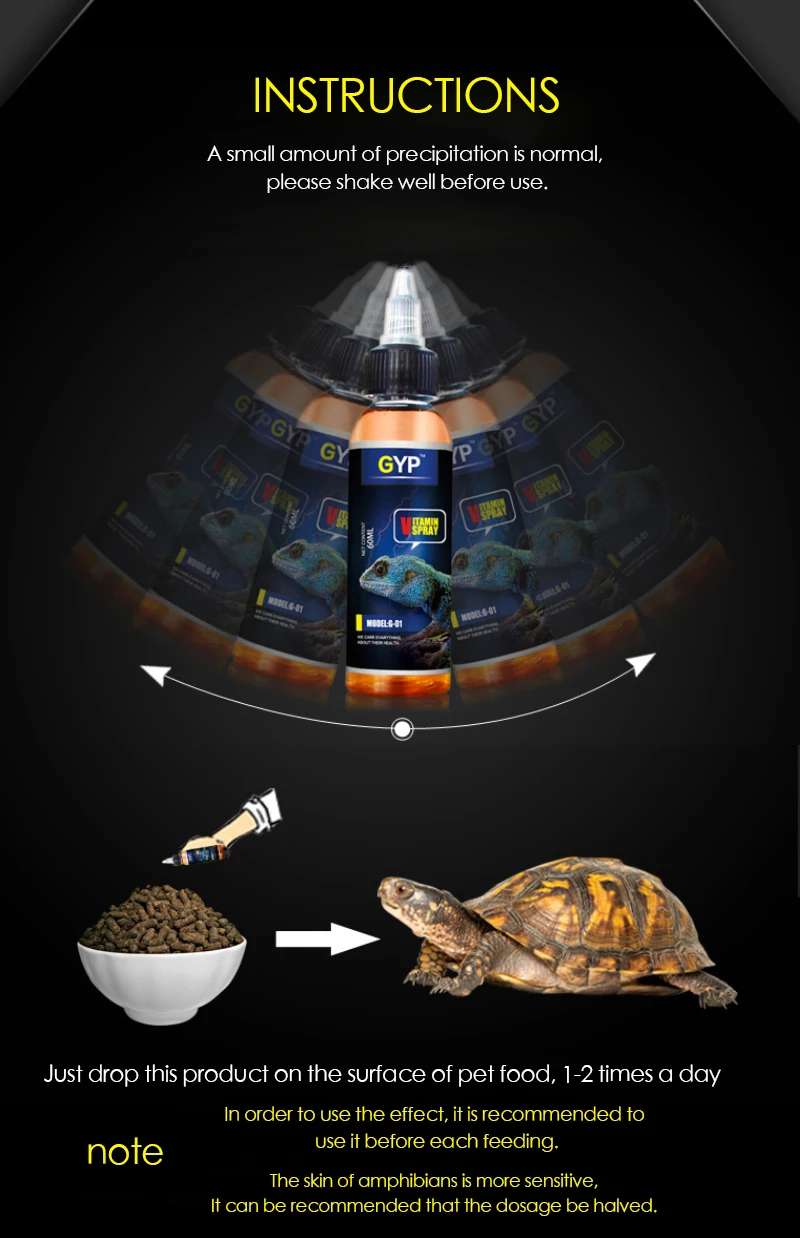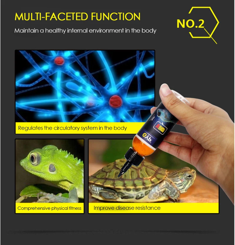 Reasons to choose us Multivitamins, immune polysaccharides, β-carotene, amino acids, concentrated biological enzymes Upgrade compound formula Designed for reptiles/improve absorption Multi-faceted function Maintain a healthy internal environment in the body Regulates the circulatory system in the body Fully replenish physical fitness Improve disease resistance Instructions A small amount of precipitation is normal, please shake well before use. Just drop this product on the surface of pet food, 1-2 times a day note In order to use the effect, it is recommended to use it before each feeding. The skin of amphibians is more sensitive, It can be recommended that the dosage be halved.