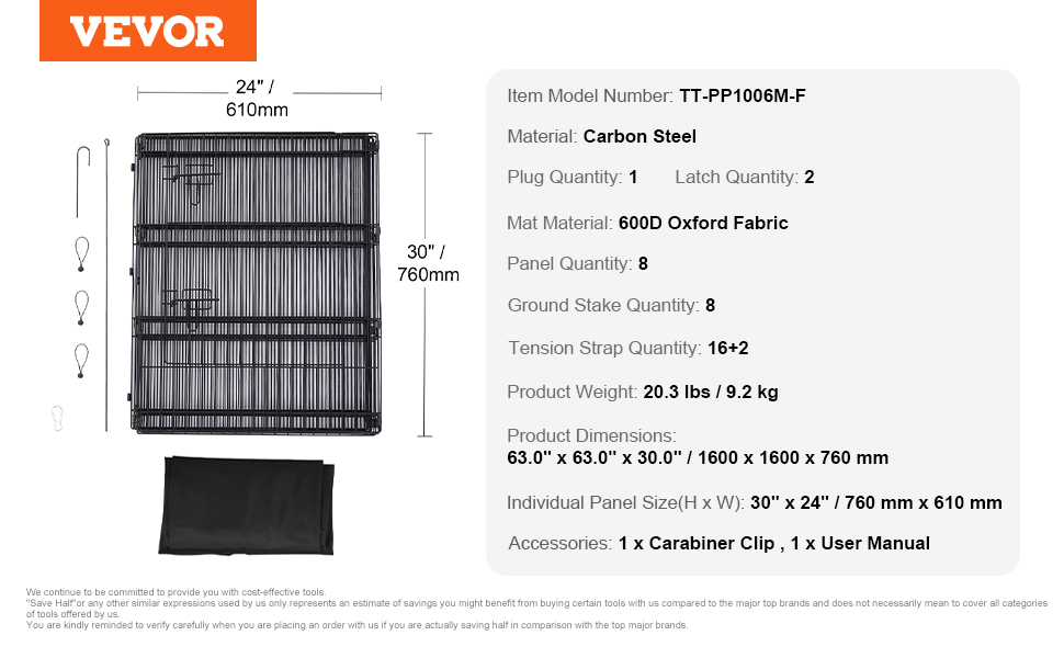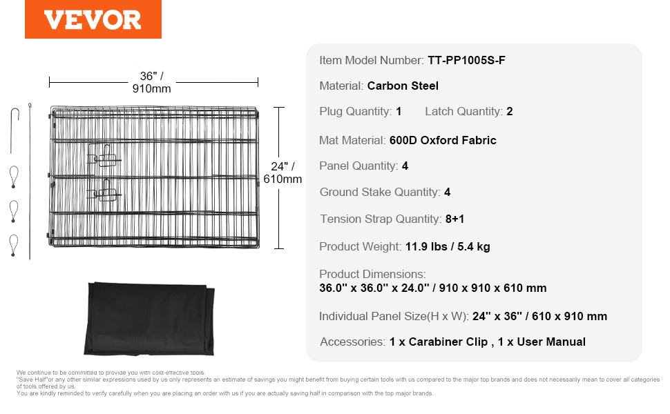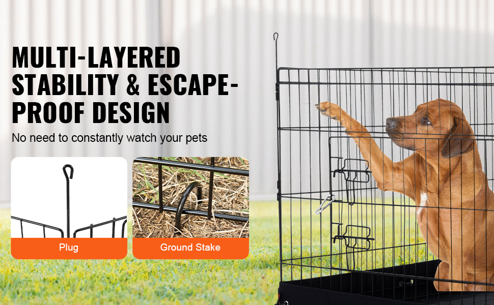 - Escape Prevention: The pet playpen includes 4 long ground stakes and 1 reinforced stake to securely anchor the playpen in place. Dual door latches and 1 carabiner clip prevent pets from opening the door and escaping. Strong, tightly-knit metal mesh resists play and chewing, and the Oxford fabric with elastic buckles is snugly fitted to the base for added security.